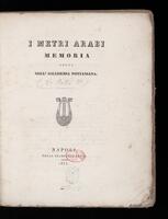 Vor dem Textanfang: I Metri Arabi. Memoria Letta Dall'Accademico Residente Vincenzio De Ritis Nella tornata del dì 23 di agosto 1829.. Tafeln gestochen von Camillo Pacces. Bibliographischer Nachweis: Catalogo SBN - IT\ICCU\SBL\0400121