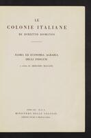 Umschlagtitel: Le colonie italiane : flora ed economia agraria degli indigeni. Vorlageform der Veröffentlichungsangabe auf dem Titelblatt: Anno 1931 - IX E. F., Ministero delle colonie, Ufficio studi e propaganda. - Auf der Rückseite des Titelblatts: Rocca S. Casciano, Stabilimento tipografico L. Cappelli